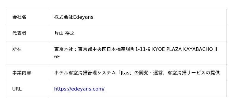 株式会社Edeyans「世界中の宿泊を支え、感動を生む。」をコーポレートミッションに掲げ、テクノロジーとオペレーションの両輪でホテル客室清掃領域の課題解決に取り組むスタートアップです。SaaS型システム「Jtas」の開発・提供に加え、自社でも客室清掃サービスを展開することで、現場知見をシステム開発にフィードバックする独自の強みを持っています。日本が世界に誇れる清掃サービスの発展と、従事する方々の地位向上を目指し事業を展開しています。