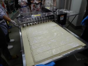 カットした餅を、脱酸素剤を入れて包装するまでの加工工程を