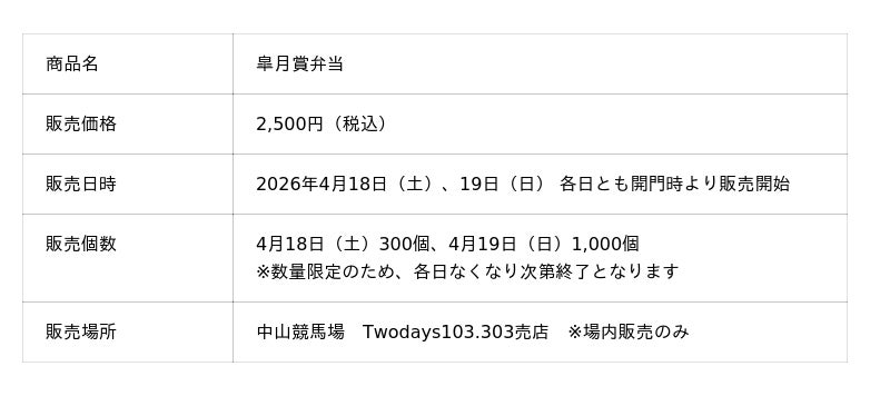 リエイグループの株式会社リエイライフ(本社:千葉県浦安市、代表取締役社長:椛澤 大樹)が展開する千葉県の老舗駅弁ブランド「マンヨーケン(万葉軒)」は、日本中央競馬会(JRA)が中山競馬場で開催する春のGIレース「第86回 皐月賞」にあわせ、2026年4月18日(土)・19日(日)の2日間、『皐月賞弁当』を数量限定で販売いたします。