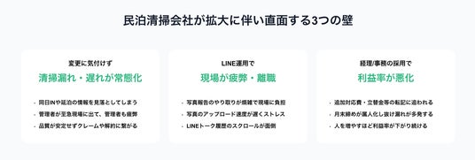 しかし、当社が2025年以降、自身でも民泊清掃事業を運営しながら、全国の100~1,000物件規模の民泊清掃会社50社以上を訪問・ヒアリングを重ねた結果、拡大していく清掃会社の多くが現場の努力では解決不可能な"構造的な3つの壁"に直面していることが判明しました。