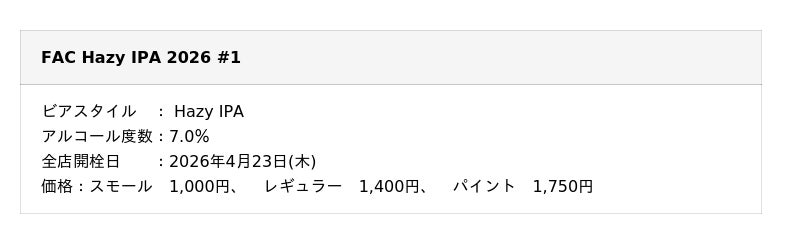 株式会社ワンダーテーブル(本社:東京都新宿区西新宿、代表取締役社長:河野 博明)は、よなよなエール公式ビアレストラン「よなよなビアワークス」にて、2026年4月23日(木)より、数量限定クラフトビール『FAC Hazy IPA 2026 #1』を提供いたします。