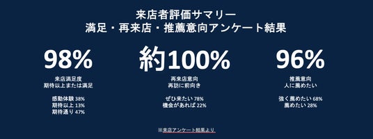 オープン1ヶ月を機に実施している顧客アンケート(回答数537名超)では、驚異的な満足度を記録しています。満足度の裏付け: 98.4%のお客様が「期待通り以上」と回答。