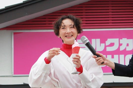 「東京でも秋田の食材を見つけたら手に取ってしまうほど。秋田のものは現場への差し入れにもよく持っていくのですが、いつも皆さんに喜んでいただけてとても嬉しく思っています。(施設の)リニューアルも嬉しいことですし、コラボさせていただいたソフトクリームスリーブのデザインについては、『道の駅にしめ はまなすの里』にちなんで、はまなすのお花の紫のようなピンクのような色をテーマに描き下ろせていただきました。スリーブと実際のはまなすミルクソフトクリームにはリンクするカラーも。今回新しくできた『ミルクカフェNISHIME 』の店内にはサインも書かせてきましたので、皆さんチェックしていただけたら嬉しいです。そしてソフトクリームを食べている画像を#いこしお秋田、#道の駅にしめでSNSに投稿したらこっそり見に行きます。」
