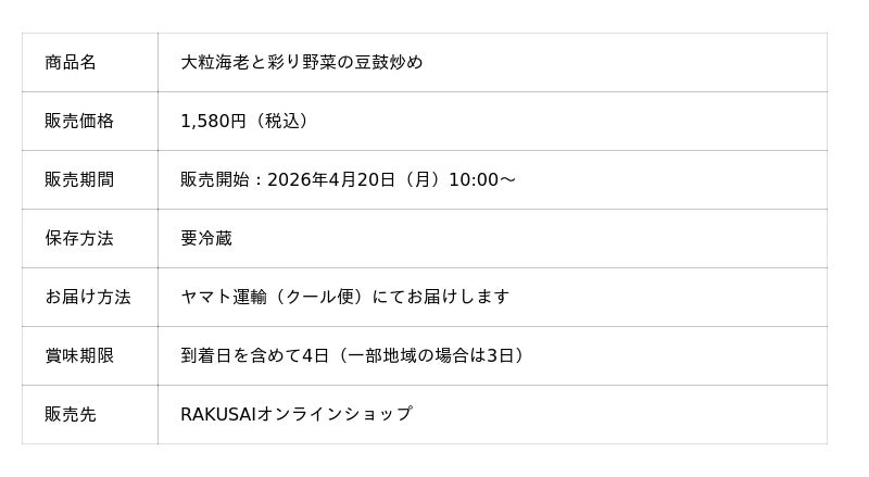 d130004-135-35a1efe697a31f114aa826f4aa833ea3.pdf 楽彩株式会社(本社:東京都足立区 代表取締役社長:大崎善保)は、厳選したカット済み野菜の鮮度と手軽さで支持されるミールキットブランド「RAKUSAI」より、新メニュー『大粒海老と彩り野菜の豆鼓炒め』を2026年4月20日(月)に発売いたします。ぷりっとした弾力の大粒海老と、鮮やかな彩り野菜。黒大豆を発酵させた漆黒の旨み調味料「豆鼓」を贅沢に使用した特製ソースが、素材の持ち味を引き立てます。シャキシャキの野菜に、豆鼓ならではの芳醇なコクが重なり、一口ごとに深く贅沢な余韻が広がります。ご自宅で過ごす時間に「本格的なひととき」を。RAKUSAIが贈る、こだわり抜いた大人のための炒めものを心ゆくまでお愉しみください。