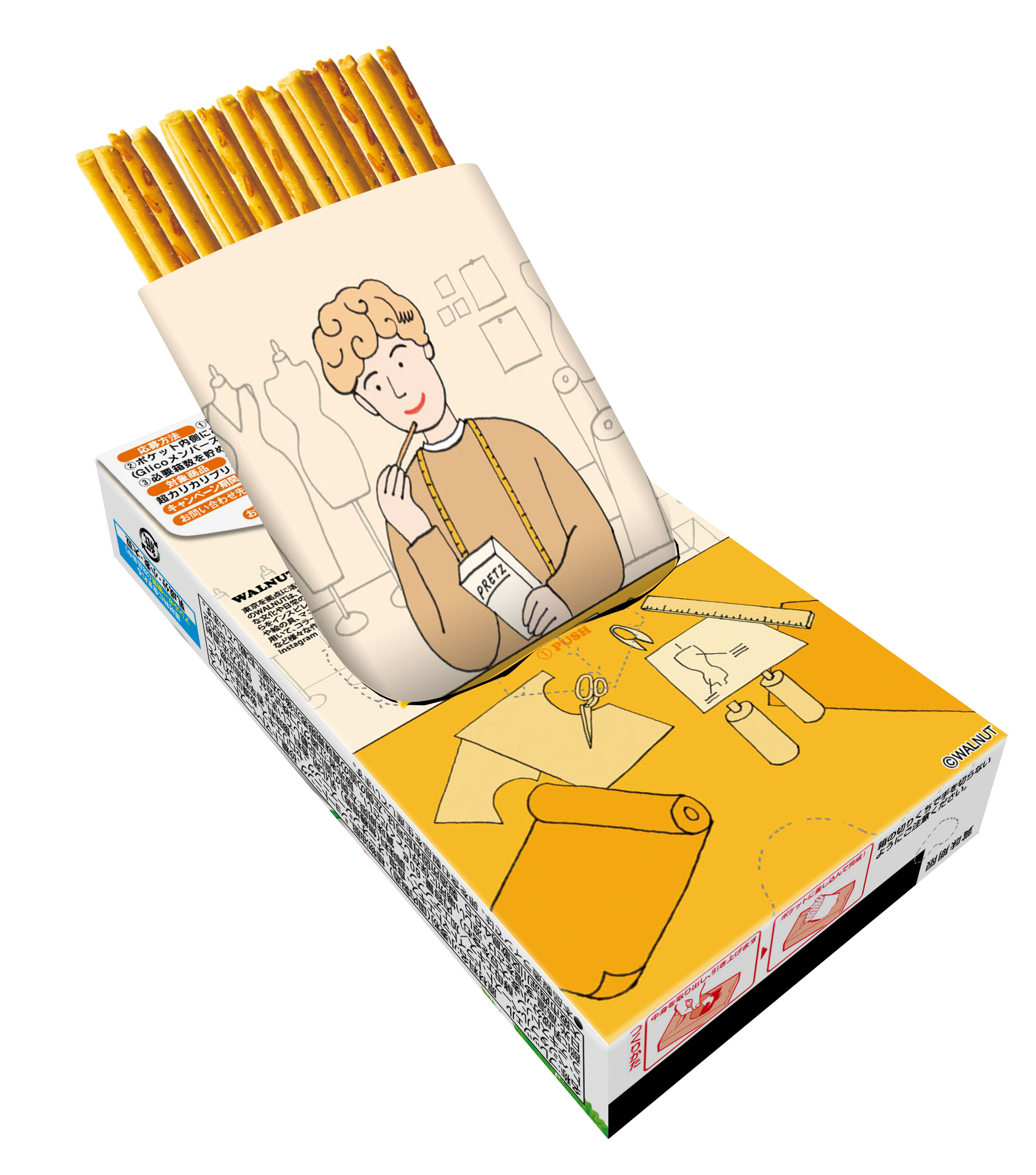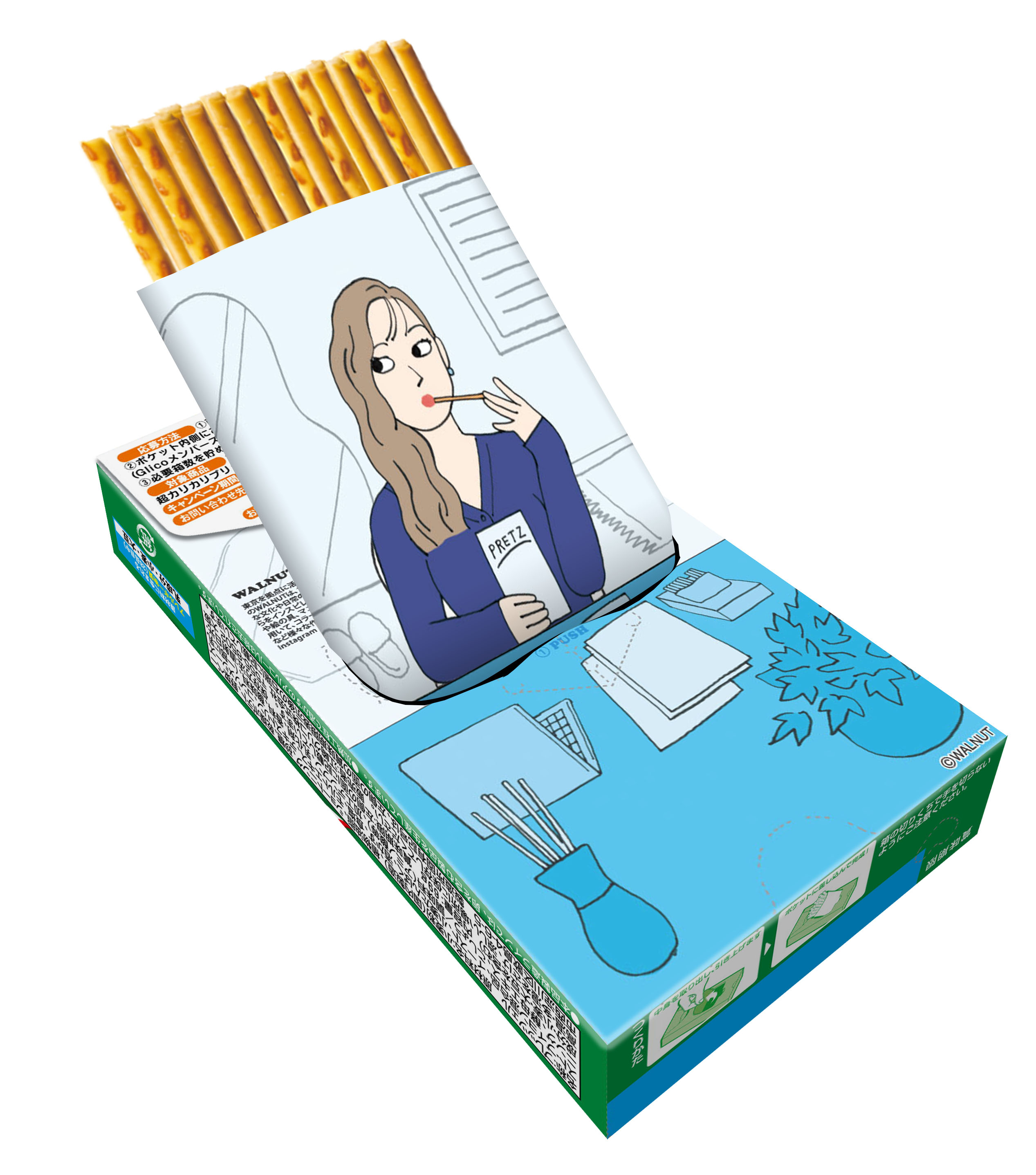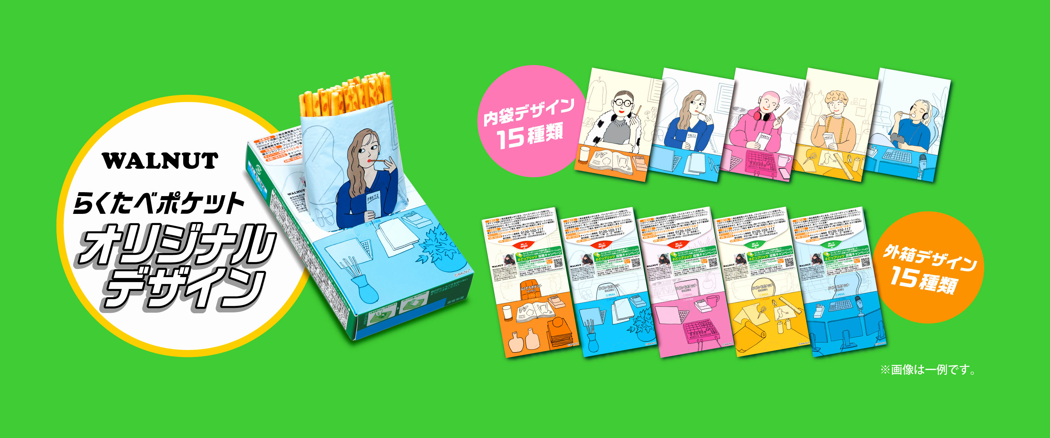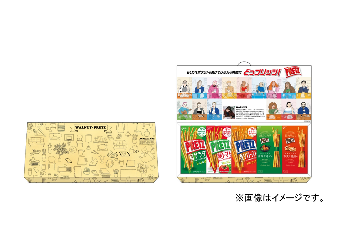 また、同日より、人気イラストレーターWALNUT氏とのコラボレーションによる「らくたべポケット」を活用した、楽しい仕掛けの限定パッケージのプリッツ(小箱5種)を期間限定で発売します。さらに、じぶん時間に活用できる景品が当たるプレゼントキャンペーンも行います。