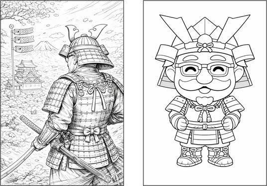 左から「武者カーネル塗り絵」デザイン1.、「武者カーネル塗り絵」デザイン2.