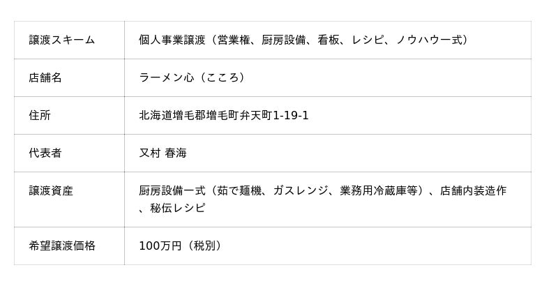 事業承継・M&Aマッチングプラットフォーム「TRANBI(トランビ)」を運営する株式会社トランビ(本社:東京都港区、代表取締役:高橋聡)は、北海道増毛町で営業していたラーメン店「ラーメン心(こころ)」(代表:又村春海)が、実名掲載の形で後継者募集を開始したことをお知らせいたします。