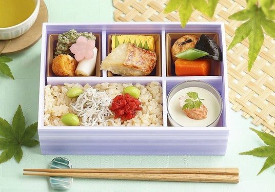 毎年人気の初夏の季節弁当は、爽やかな藤色の折箱に、季節の変わり目にふさわしい料理をお詰めしてリニューアルしました。今年は、出汁と生姜の味わいが相まった生姜御飯に、旨みのしっかりした釜揚げしらすや、カリカリの刻み梅を合わせました。新緑をイメージした「枝豆スープゼリー」は、北海道中札内村産の枝豆を使用した、なめらかな舌触りが魅力の一品です。また、定番の赤魚西京焼、出汁の風味豊かな煮物もお詰めして、涼やかな見た目になるよう彩りよく仕上げました。魚料理と煮物を中心とした献立は、あっさりとした後味と全体のボリュームを調整し、最後まで軽やかにお召し上がりいただける内容となっております。
