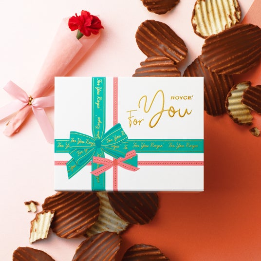 パリッとしたポテトチップの片面に、口どけの良いチョコレートをコーティングした甘さと塩味の絶妙なバランスがクセになるおいしさのポテトチップチョコレート。「For you」の文字と大きなリボンをデザインしたギフト用スリーブを付けて、さらに母の日にぴったりのカーネーションの造花をクリアケースに入れてお届けいたします。
