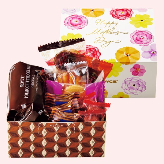ポテトチップチョコレートをメインに、バラエティ豊かな焼き菓子やチョコレート菓子を詰め合わせた華やかなアソートボックス・LINEギフト限定「ロイズバラエティギフトボックス」に、母の日専用スリーブをセットしました。スリーブには、「Happy Mother's Day」の文字とカーネーションなどの花をデザイン。花の部分をドレスに見立て、ドレスを着た女性が踊っているようにも見えるあしらいにしています。さらにクリアケースに入れたカーネーションの造花が1輪付いた、母の日ギフトにぴったりのセットです。