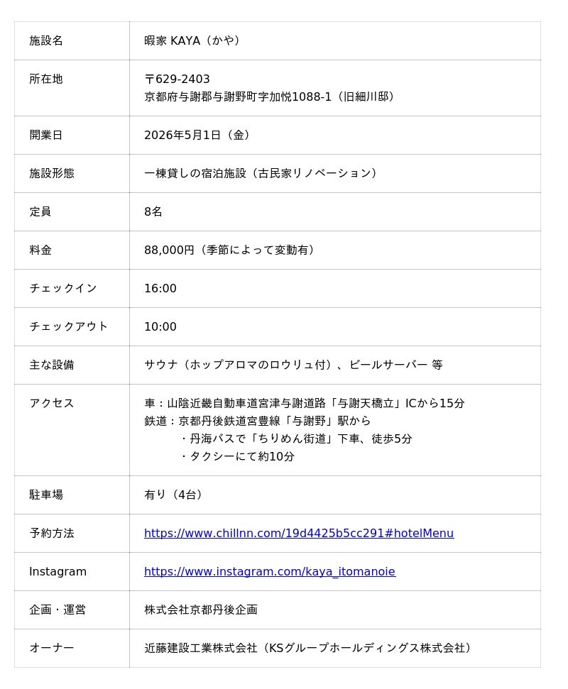 丹後地域のまちづくりを担う地域会社 株式会社京都丹後企画(本社:京都府与謝郡与謝野町、代表取締役:濱田祐太、以下「京都丹後企画」)は、京都府与謝野町・ちりめん街道にて、古民家をリノベーションした一棟貸しの宿「暇家 KAYA」を2026年5月1日(金)に開業いたします。京都丹後企画は、株式会社ローカルフラッグと株式会社NEWLOCALの合弁により2024年に創業した地域会社で、当施設のプロデュース・運営を担当。オーナーは、不動産開発・再生事業を展開する近藤建設工業株式会社(KSグループホールディングス株式会社)です。