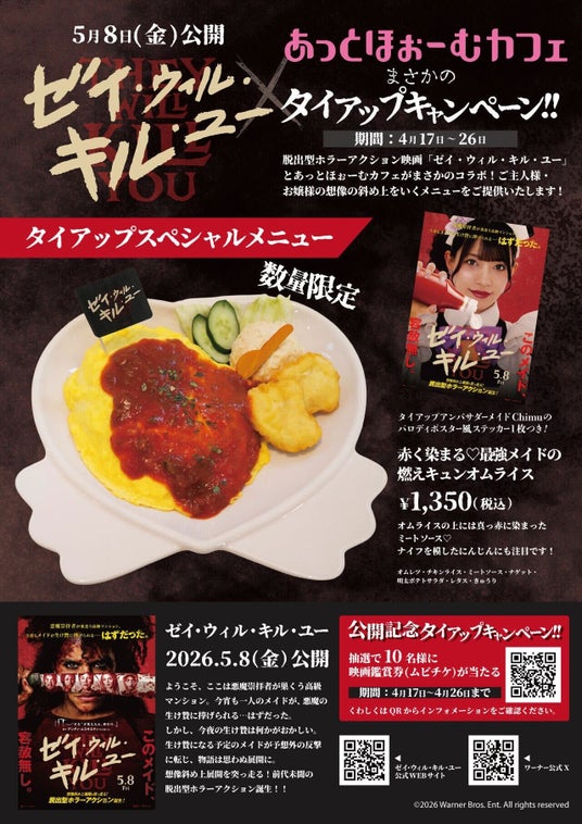 インフィニア株式会社(本社:東京都千代田区、代表取締役:深沢孝樹)が運営するメイドカフェ「あっとほぉーむカフェ」は、2026年4月17日(金)から4月26日(日)までの期間、「あっとほぉーむカフェ 秋葉原ドンキ店」にて、脱出型ホラーアクション映画『ゼイ・ウィル・キル・ユー』とのタイアップキャンペーンを開催いたします。