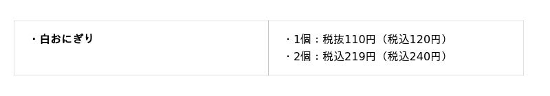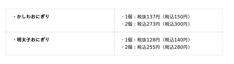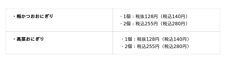 ※「明太子おにぎり」の「のり付き」は、1個:上記価格+税込20円、2個:上記価格+税込40円
