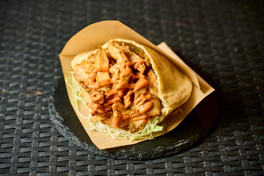 ピタパンやチャパティ(全粒粉と水を捏ねて生地を作り、発酵させずに薄い円形にのばして焼いたものである)とケバブチキン、キャベツ、ソースの一体感を味わえます。