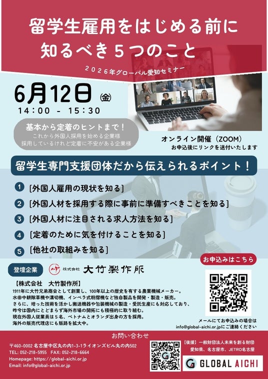 東海4県を中心に外国人留学生と企業のマッチングを行う一般社団法人グローバル愛知が、外国人雇用の基礎から実践までが分かるセミナーを開催します。留学生紹介に特化した専門団体だからこそお伝えできる視点で、外国人雇用の基本情報はもちろん、外国人材が日本企業に定着するために企業側が押さえるべきポイントや、優秀な人材に選ばれるための求人の考え方について、分かりやすくご紹介します。