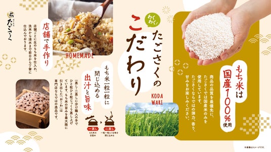 株式会社グリーンハウスフーズが展開するおこわ専門店「たごさく」は、世界各国の料理をモチーフにした、新たなラインアップである「おこわールド」を中心に、もち米を使用した新商品を4月22日(水)にオープンする「ペリエ稲毛」店限定で販売開始いたします。