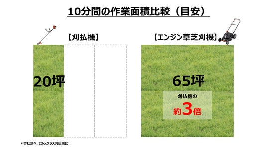 一般的な刈払機とエンジン草芝刈機(EFB-53D)で10分間に草刈りできる作業面積を比較すると、エンジン草芝刈機が約3倍(*3)も早く作業でき、夏場の草刈り時間を大幅に短縮できます。