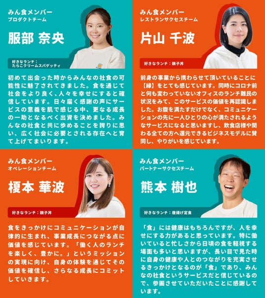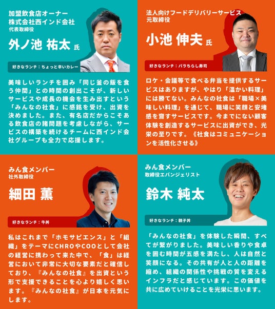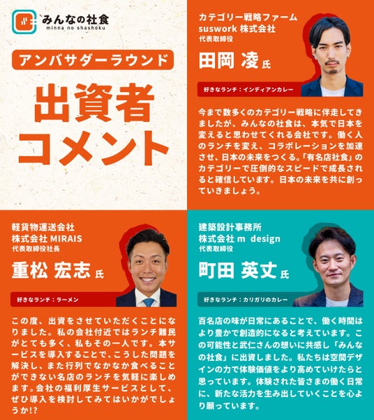 前回のシードラウンド以降、想定を超えるペースで多くの企業様にご導入いただき、こうしてプレシリーズAを実施できたことを大変嬉しく思っております。そして今回、この資金調達をアンバサダーラウンドという形で行うことを決めました。「みんなの社食」は働く人の食のインフラを目指しており、プラットフォームである以上、飲食店様・配送パートナー様・導入企業様、そして私たち自身のチームメンバーを含むあらゆるステークホルダーと共に創り上げていくものです。ありがたいことに、日頃から関わってくださる方々の中から「一緒に広げたい」「応援したい」と声を上げてくださる方が多くいらっしゃいました。
