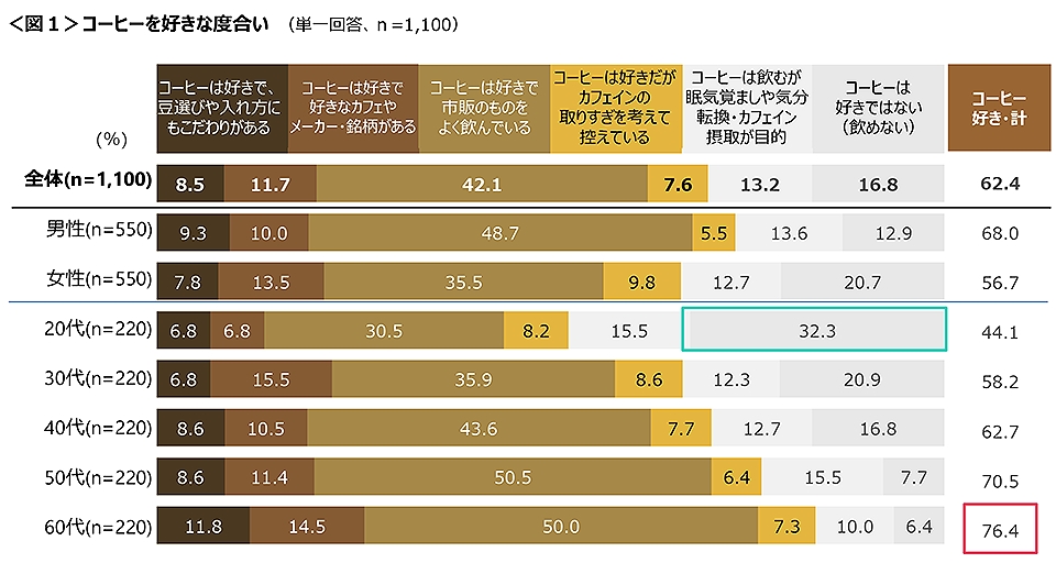 年代差がみられる「コーヒー好き」20代では4割に留まる