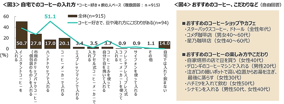 ただし、“豆選びや入れ方にもこだわりがある”人では全体の傾向と異なり、「ハンドドリップ」が最も多く5割を超えている。こだわり派は手間をかけて入れ、コーヒータイムを楽しんでいる様子がうかがえる。<図3>