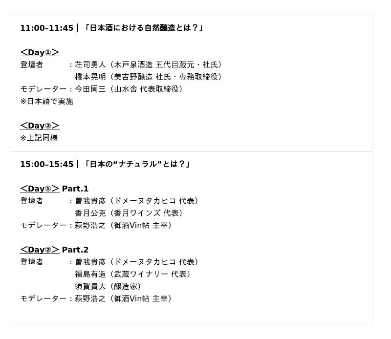 両日を通じて無料のマスタークラスやセミナーを開催予定です。ワインだけでなく、日本ならではのテーマとして日本酒におけるナチュラル醸造なども取り上げ、生産者と来場者の直接的な対話を通じて、日本の発酵文化やナチュラルな醸造手法への理解をより深める機会を提供します。