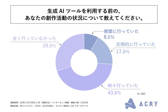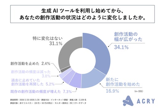 創作活動の経験がある非クリエイターの3人に1人以上が、生成AIツールを利用し始めてから「創作活動の幅が広がった」と回答