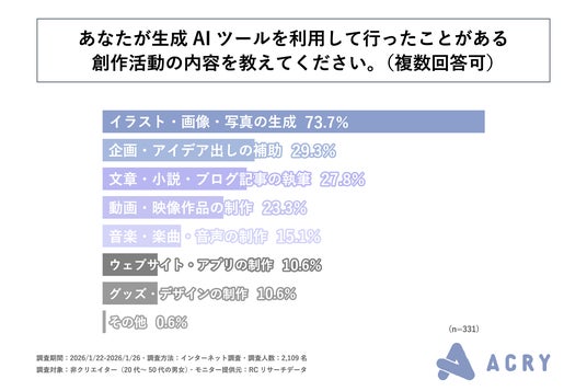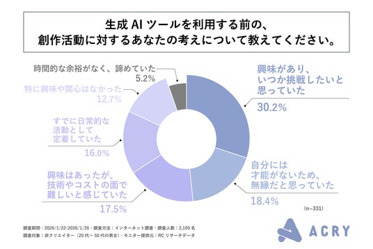 AMBI株式会社(本社:大阪府大阪市、代表取締役:岡本 渡)が運営する「ACRY(アクリー)」は、非クリエイター(20代~50代の男女)を対象に「AI時代における非クリエイターの創作活動に関する調査」を実施しました。この調査から、非クリエイターにおける生成AIツールを利用した創作活動の経験、生成AIツールの利用をきっかけとした創作活動への意識や活動範囲の変化などが明らかになりました。