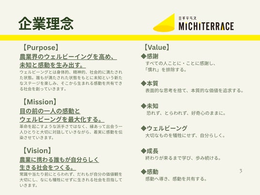 「農業に携わる誰もが自分らしく生きる社会をつくる」 。 常識や当たり前にとらわれず、誰もが自分の価値観を大切にし、何も犠牲にせずに生きられる社会 。その「未知」のステージを楽しみ、感動を共有できるプラットフォームとして、ミチテラスは農業界の未来を照らし続けます 。