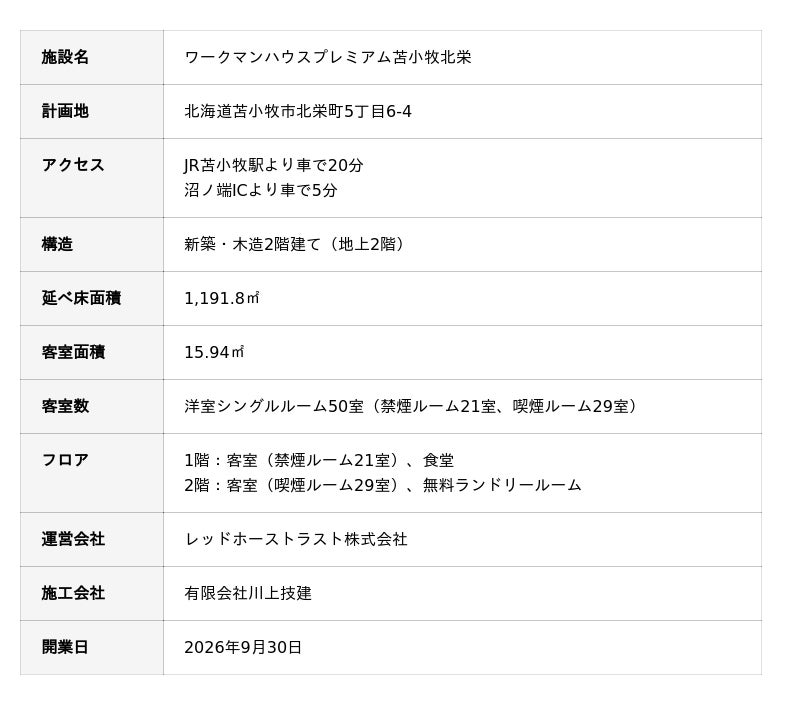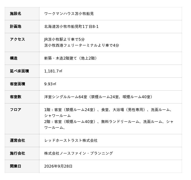 レッドホーストラスト株式会社(本社:北海道札幌市中央区 代表取締役社長:八重樫暁 以下レッドホーストラスト)は、深刻な宿不足が想定されている北海道・苫小牧市に、長期ビジネス出張者向け宿泊施設「ワークマンハウス苫小牧船見」と「ワークマンハウスプレミアム苫小牧北栄」を2店舗同時オープンいたします。