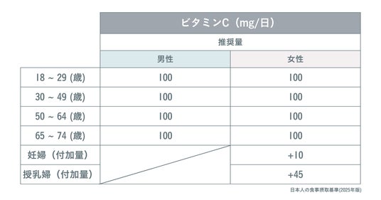 成人におけるビタミンCの推奨量は1日100mg(*3)。 イチゴなら約10粒分、ゴールドキウイなら約1個分(*4)と、食事からの摂取で満たせる量に思えます。