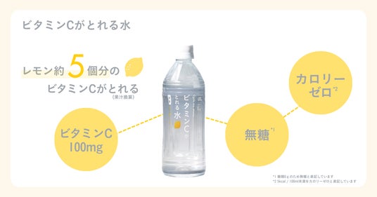 株式会社ドットミーが展開するCycle.me(サイクルミー)は、新商品「ビタミンCがとれる水」を4月27日(月)より発売します。本商品は、無糖・カロリーゼロ(*1)でありながら、1日分のビタミンCを手軽にとることができる水。(*2)すっきりとした飲み心地に、レモンピールをイメージした清涼感のある後味が特徴です。
