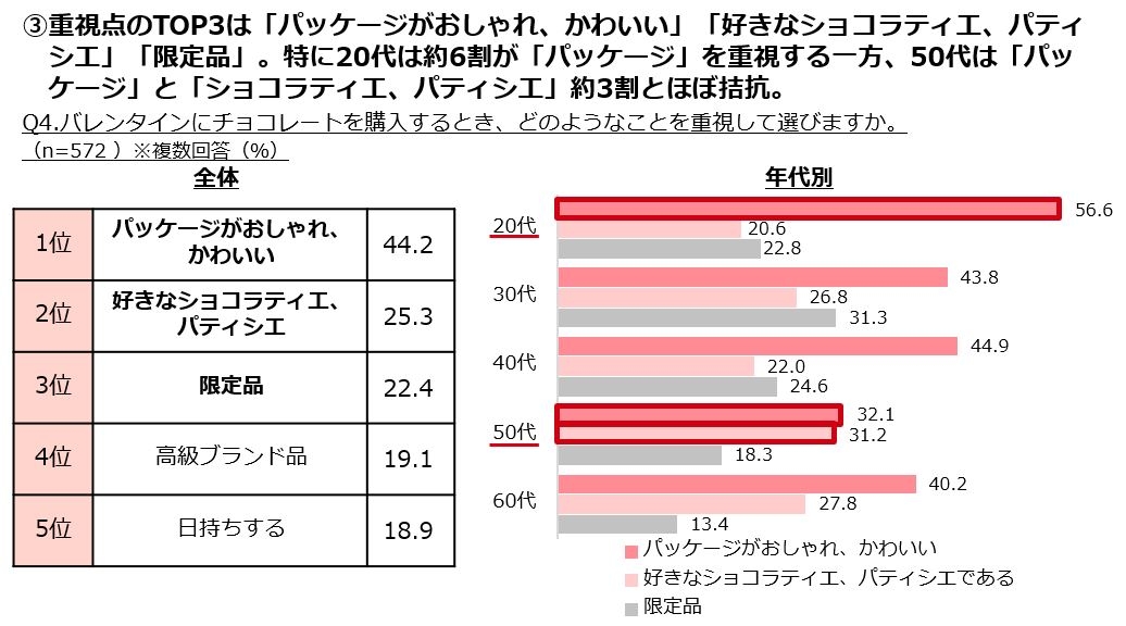 ③ 重視点のTOP3は「パッケージがおしゃれ、かわいい」「好きなショコラティエ、パティシエ」「限定品」。