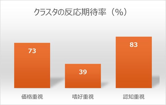 また、今回作成した3種類のクラスタについては実際にクーポンを配信する前に仮想マーケティング技術を使い、バナーの閲覧やクーポンの表示、商品の購入などクーポンに対してお客さまが行動を起こす可能性を示す「反応期待率」の予測をクラスタごとに行いました。その結果、自分の好みを重視するという特性をもつ「嗜好重視」クラスタの「反応期待率」の数値は低く、実際の配信においても「嗜好重視」クラスタに類似するお客様のクーポン表示率および購入率も低くなる可能性があるという見解を立てていました。