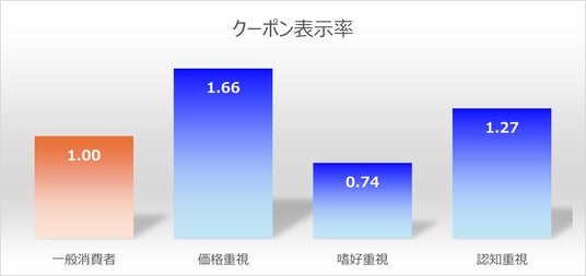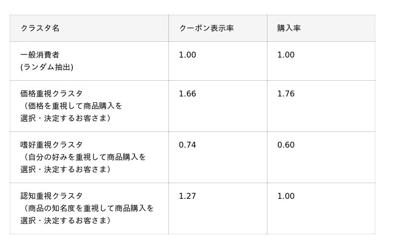 本実証の結果、価格を重視する「価格重視」クラスタでは、一般のお客さまと比較してクーポン表示率が1.66倍、購入率が1.76倍とクーポンへの反応が最も高いという結果が見られました。また、自分の好みを重視する「嗜好重視」クラスタは一般のお客さまと比較して、クーポン表示率が0.74倍、購入率が0.6倍と「反応期待率」から予測した見解の通り、クーポンへの反応が低いという結果となりました。