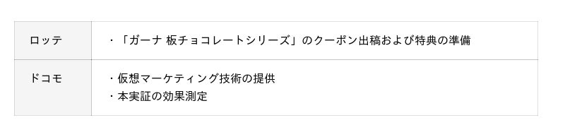 ロッテとドコモはそれぞれ、本実証で得られた知見を活かし、仮想マーケティング技術を活用したマーケティング支援サービスの開発・提供や、より効果的なマーケティングの実施をめざします。