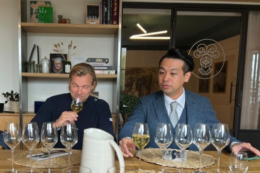 テルモン メゾン(エペルネ近郊ダムリー)にてテイスティングを行うテルモン プレジデント・ルドヴィック・ドゥ・ブレシ氏(左)と Cuvee J2 アドバイザー・佐長東彦(右)
