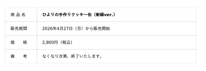 ジェイアール東海フードサービス株式会社(本社:愛知県名古屋市、代表取締役社長:岩下賢一)は、オリジナルスイーツ「ぴよりん」をモチーフにした「ひよりの手作りクッキー缶」の新緑の季節をイメージした限定バージョンを、2026年4月27日(月)から、ぴよりんshopアトリエ店、ぴよりんshopにて販売いたします。
