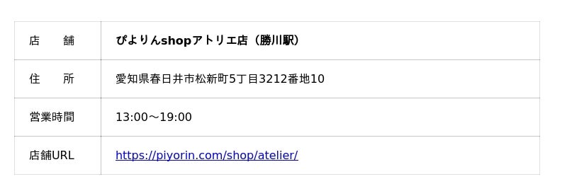 通常はぴよりんshopアトリエ店のみの販売ですが、今回は名古屋駅の「ぴよりんshop」でもご購入いただけます。名古屋駅にお越しの際は、ぜひお気軽にお立ち寄りください。