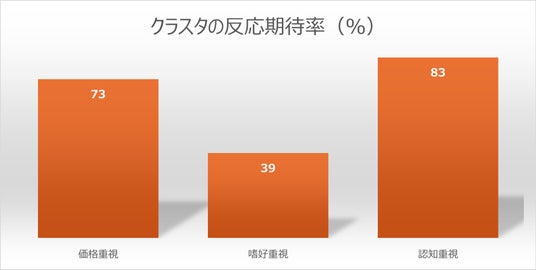 また、今回作成した3種類のクラスタについては実際にクーポンを配信する前に仮想マーケティング技術を使い、バナーの閲覧やクーポンの表示、商品の購入などクーポンに対してお客さまが行動を起こす可能性を示す「反応期待率」の予測をクラスタごとに行いました。その結果、自分の好みを重視するという特性をもつ「嗜好重視」クラスタの「反応期待率」の数値は低く、実際の配信においても「嗜好重視」クラスタに類似するお客様のクーポン表示率および購入率も低くなる可能性があるという見解を立てていました。