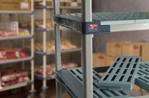 樹脂製シェルフ「メトロマックスシリーズ」棚板マットは取り外して洗浄が可能。抗菌加工素材でいつまでも衛生的にご使用いただけるシェルフです。洗浄機や次亜塩素酸ナトリウムでの清掃にも対応しています。