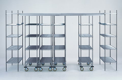 移動棚「トップトラックシステム」樹脂・ステンレスなど様々なシェルフに対応。レールが床面ではなくシェルフの上部にあるので、カートによるピッキング作業も容易に行え、作業の効率化が図れます。