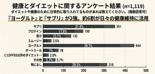 C COFFEE以外で健康やダイエットのために取り入れているものとして、ヨーグルトを上げた会員が約4割(39.7%)に。余分なものを体にため込まず、すっきりさせることを大切に考えていることがわかりました。