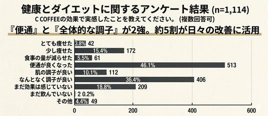 C COFFEEの実感で最も多いのが「便通」で、約半数(46.1%)が「便通がよくなった」と回答しています。また次点で多かったのが「なんとなく調子が良い」という回答(36.4%)。ため込まない、快適な毎日を送れている様子がわかります。