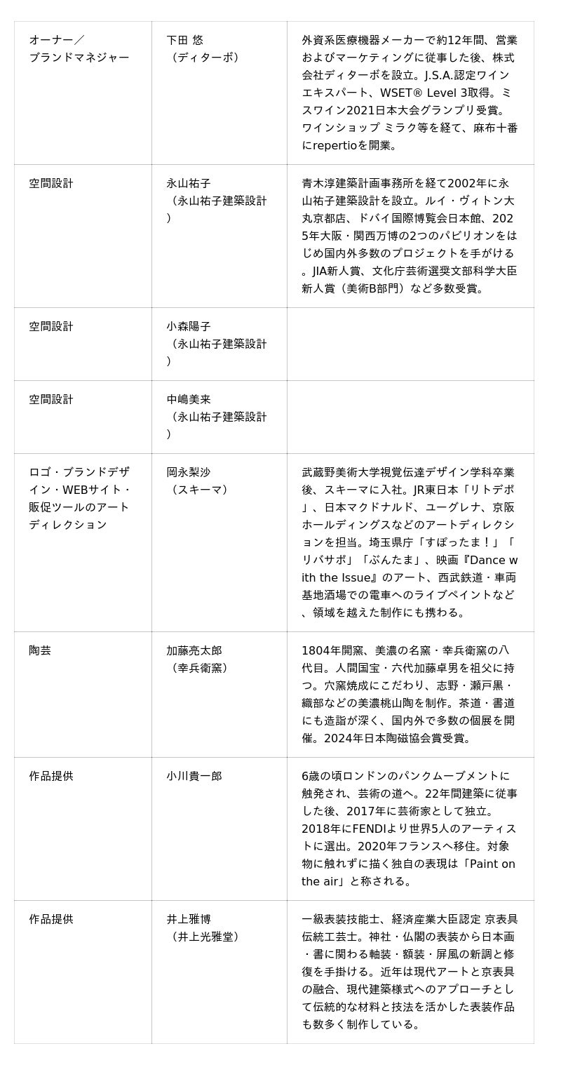 建築家、陶芸家、アーティスト、表具師--それぞれの領域で本質を追い続けてきた方たちとの共創によってrepertioは生まれました。「こういう場所が、今の東京に必要なのではないか」--その問いに、各分野の第一人者が応えてくれたこと自体が、このプロジェクトの可能性を示していると感じています。