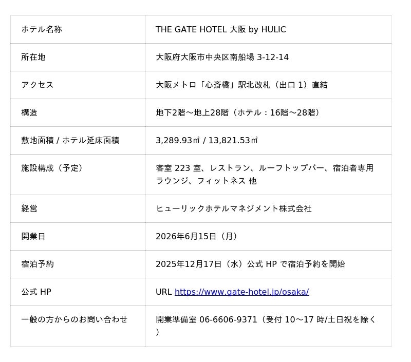 2026年6月15日開業予定 ザ・ゲートホテル大阪 by HULIC(大阪府大阪市中央区南船場 3-12-14)