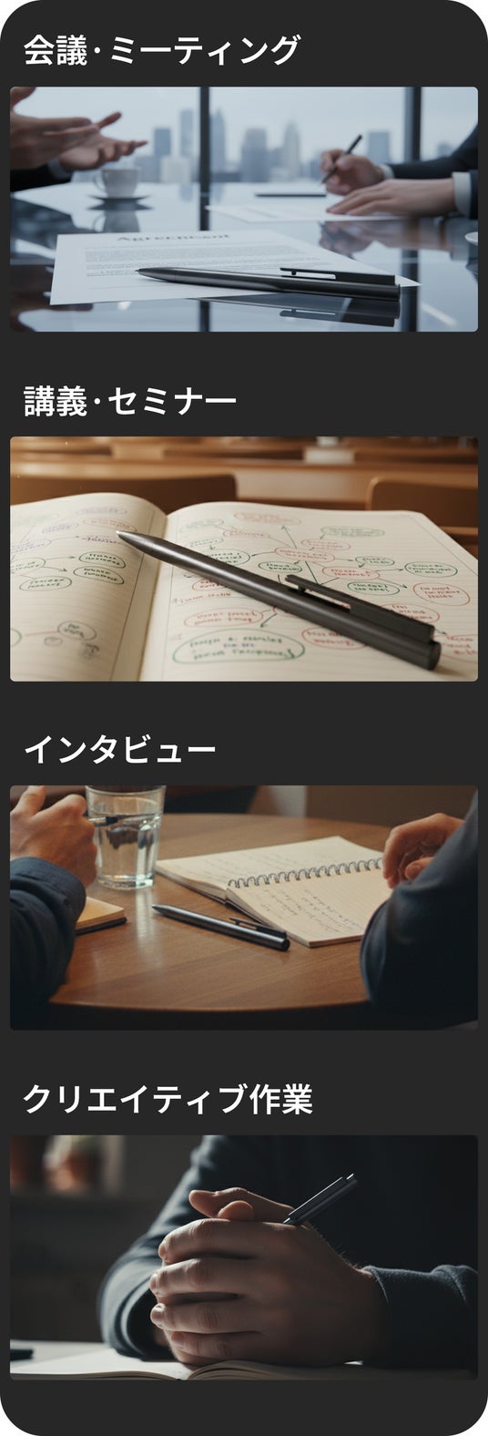 操作ボタンはペンボディと完全に一体化しています。手にしたまま、自然な動きで録音を開始できるため、相手に気づかれることなく、大切な対話をそのままの形で記録します。