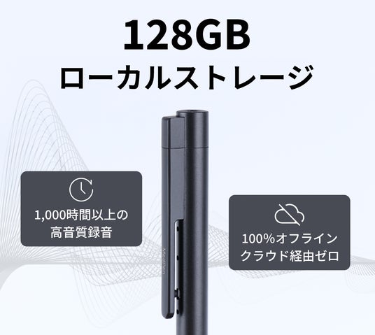 すべての録音データは、インターネットから完全に隔離された機内の128GB大容量ストレージに、暗号化されて直接保存されます。クラウドやネットワークを経由しないため、外部へのデータ流出の心配は一切ありません。安心して1,000時間以上の高音質な録音を保存可能。