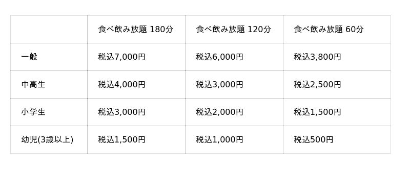 今年は通常の120分コースに加え、サクッと楽しんでいただける60分コースと、のんびりビアガーデンを満喫していただける180分コースができました。ご都合や用途にあわせて、お時間を調整いただけます!【料金】