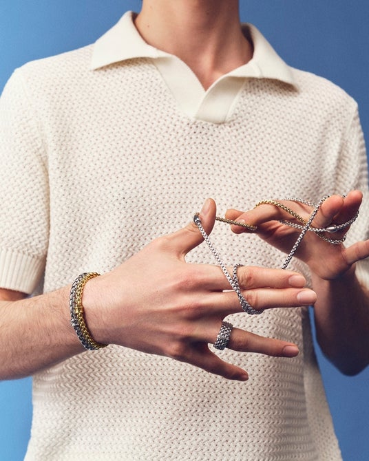 100%18Kゴールド製でありながら伸縮性があり、ロールオンで簡単に着用できる「FLEX’IT(フレグジット)」ブレスレットはFOPEのアイコン。熟練した職人技と最新鋭のテクノロジーが融合した唯一無二のゴールドジュエリーです。そんなFOPEのジュエリーは、男女を問わず毎日着けられる上質で本物のエブリデイジュエリー。ビジネスやパーティでのフォーマルな装いにも、ジーンズとシャツのようなカジュアルルックにも、またゴルフなどのスポーツシーンでも、ロールオンで気軽に着用できます。