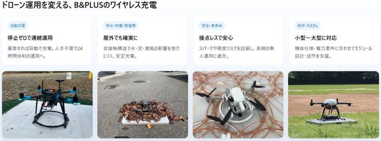 ビー・アンド・プラスでは、ワイヤレス給電技術を軸に、ドローンをはじめとする各種アプリケーションへの展開を進めています。今後は、用途ごとのニーズに応じた試作開発を通じて、最適なワイヤレス給電システムの提供を行い、実運用への適用を加速していきます。